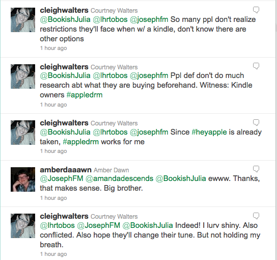 UPDATE 11:48 AM: Here are screen shots of our discussions prior to adding the #AppleDRM hashtag. This was my original tweet: