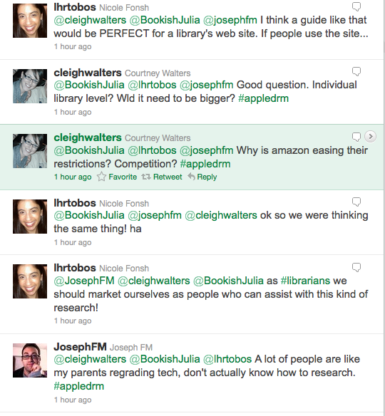 These discussions have been absolutely incredible (most are under the #AppleDRM hashtag, although others aren’t but will be added on here later today,) and have resulted into us putting our heads together and deciding a possible way to be part of the solution. We’ve decided that combining the skill sets of a number of different librarians/info pros can result in an awesome user guide! Courtney Walters is making a Google Doc (link to be placed here when it’s available) on which we can all share links, resources, and tips for effectively conducting consumer research. Then, the guide will be made publicly available online (probably as a WordPress page) and will be a (at least somewhat) exhaustive resource that librarians can share with their patrons to help them make more informed choices. More information to be added here as it becomes available!