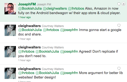 UPDATE June 17th: The Google Doc has been filling up with some awesome insight, and Courtney Walters has set up a WordPress site where all of that lovely info can be organized in a more user-friendly way. Check it out here: http://librarygadgets.wordpress.com/ and remember to keep adding your thoughts to the Google Doc!