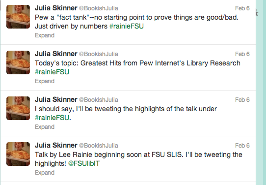 I’ve compiled my tweets (available here), and would love to hear from readers about what you think of her ideas. Anything I missed? Anything that sparks your interest or that you agree (or disagree) with as a researcher or practitioner? We have a few more speakers in the coming weeks, so make sure to follow along at #fsuslis13 as attendees tweet the highlights, and join in the conversation!